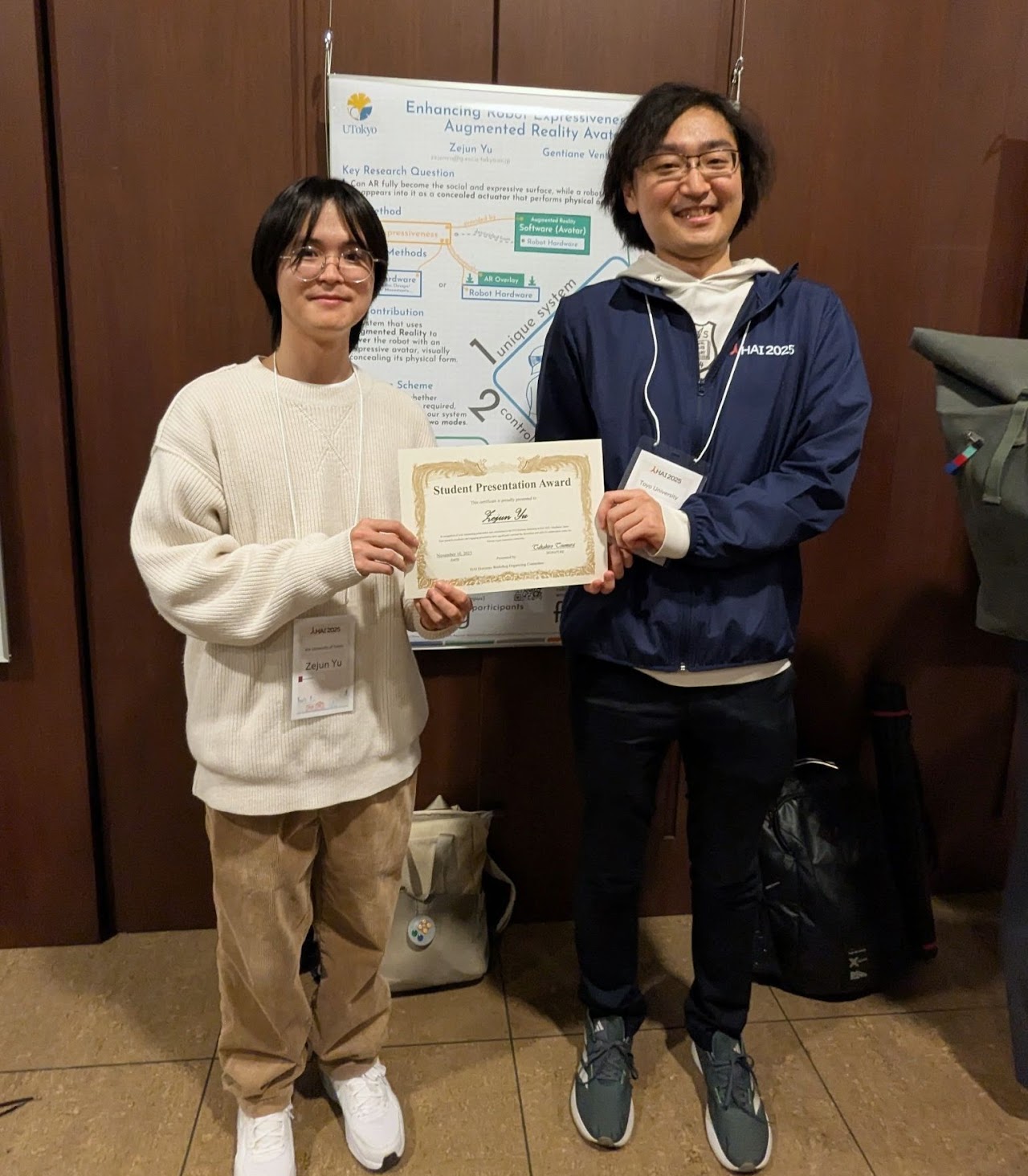 Y. Zejun received the HAI Horizons Student Award for his paper on "Enhancing Robot Expressiveness with Augmented Reality Avatar".